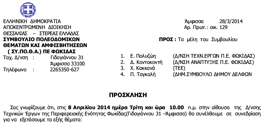 Το ΣΥ.ΠΟ.Θ.Α. (Συμβούλιο Πολεοδομικών Θεμάτων και Αμφισβητήσεων) της Π.Ε. Φωκίδος, θα συνεδριάσει στις 8 -4-2014 σύμφωνα με την πρόσκληση προς τα 4 (τέσσερα) μέλη του, προκειμένου να επιληφθεί πολεοδομικών θεμάτων και να αποφανθεί επί αμφισβητήσεων.