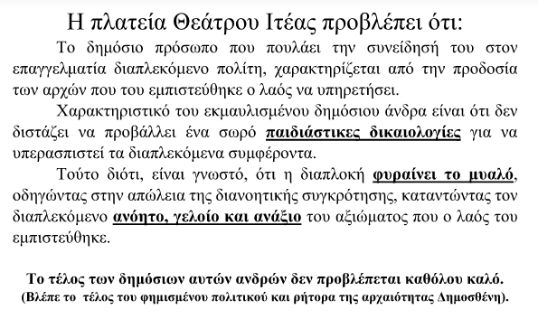 Η ΠΛΑΤΕΙΑ ΘΕΑΤΡΟΥ ΙΤΕΑΣ (προσωποποιημένη...) ΕΥΧΕΤΑΙ, ΣΥΜΒΟΥΛΕΥΕΙ, ΧΑΡΑΚΤΗΡΙΖΕΙ ΚΑΙ ΠΡΟΒΛΕΠΕΙ!... (επιστολή περιοίκου)