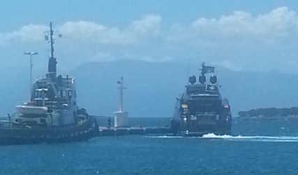 εμπρός από το εκεί ήδη προσδεδεμένο ρυμουλκό, με την κατασκευαστική και εμφανισιακή διαφορετικότητα των δυο σκαφών, να θυμίζει το γνωστό παραμύθι "Η Πεντάμορφη και το Τέρας", όπως είπε και ένας από τους παρισταμένους, σε αυτή την ολιγόλεπτη διαδικασία της καβοδεσίας του.