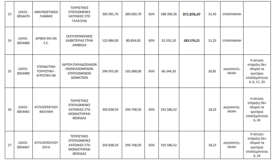 Από το τελικό σύνολο των 52 (πενήντα δύο) υποβληθέντων (φακέλλων)αιτήσεων, ενεκρίθησαν οι 33 (τριάντα τρεις) και απερρίφθησαν για διαφόρους λόγους 19 (δέκα εννέα).